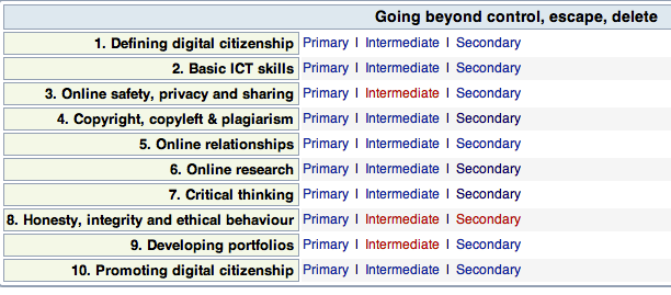 Working from this definition a group of committed teachers co-created the digital citizenship wikieducator site which is an incredible resource for teaching young people to be better citizens in a digital world. The image below shows all the different sections on this site. The sections that I regularly use with students are the links slightly showing up in purple: Plagiarism, online research and critical thinking.
