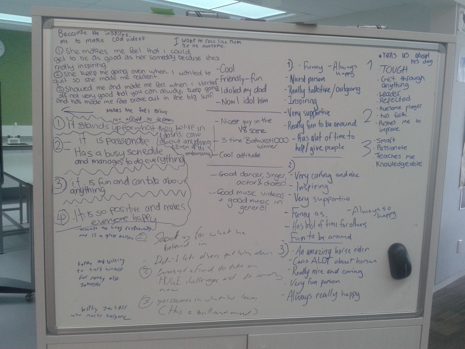 I answered that it could be absolutely anyone that inspired them, that there were no boundaries on who they could choose. Students then shared their choices on a whiteboard and we discussed as a group who some of the people were.