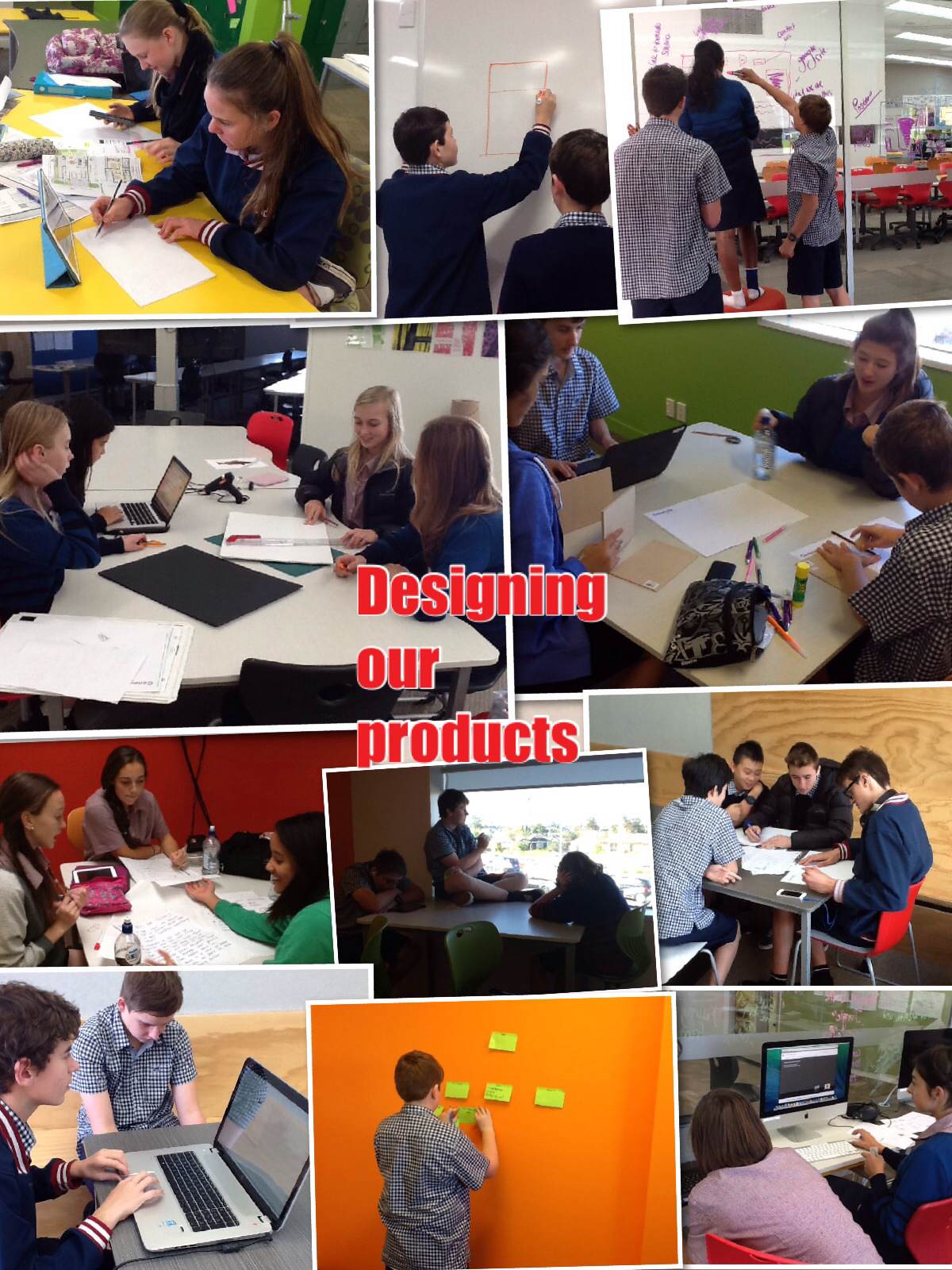 The students automatically just chose the mode that suited them for designing their products. We had not set any boundaries around this part and subsequently we saw a range of modes used: laptops, online programs, post-its, window pens, paper brainstorms, whiteboards…