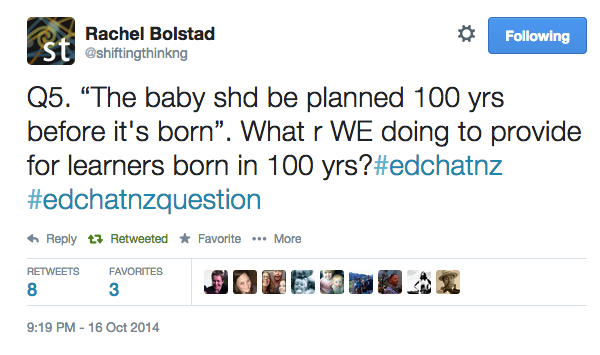 3. To pause on #edchatnz is indeed historical. At a time when we wring our hands because the model of education is not changing quickly enough to meet today’s student needs, the idea that we need to think about an unknown future deserves a pause and consideration. Thanks Steve.