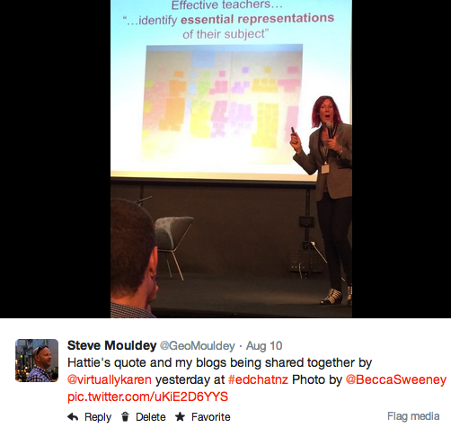 7. A surreal moment as Karen Melhuish-Spencer quoted Hattie whilst using examples from my blog in her final keynote. Snip20140813_18 It showed to me that sure there are big researcher types in this world but lets look to what we are doing in our schools as there is plenty of great practice happening around us if we share it.